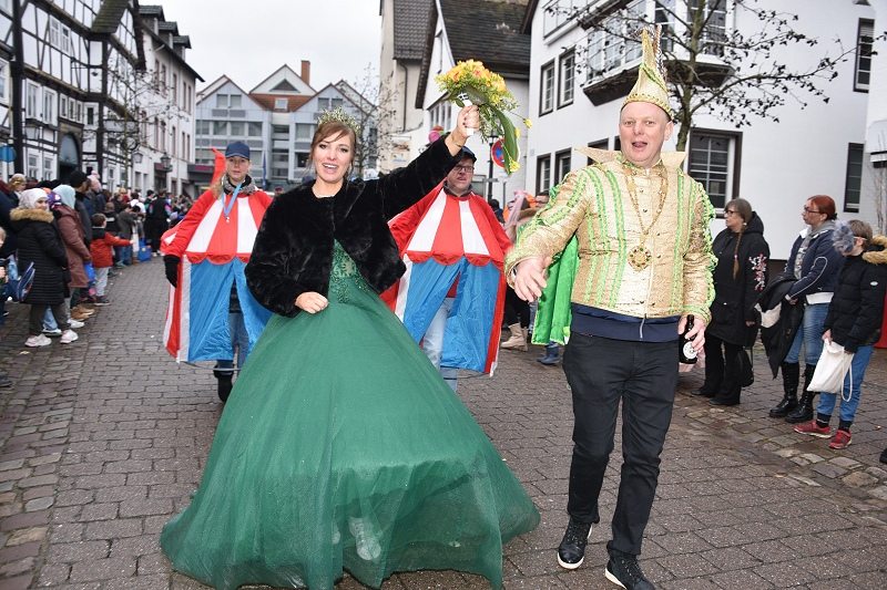 Beverungen/Lauenförde (TKu). Zirkuslöwen, Wahrsagerinnen, Clowns und Popcorntüten: Beim Rosenmontagsumzug in Beverungen gab es nichts, was es nicht gab, passend zum diesjährigen Karnevalsmotto des CVWB: „Manege frei für Groß und Klein, im Carneval ist der Zirkus los!“. Vorhang auf und Bühne frei, der Zirkus ist in der Stadt: Mit „Weserbrücke Helau!“ hieß es an allen Ecken im niedersächsischen Lauenförde und westfälischen Beverungen. Mit einem farbenfrohen Spektakel zog der Rosenmontagsumzug durch die Straßen von Beverungen und Lauenförde. Unter dem diesjährigen Motto "Manege frei für Groß und Klein, im Carneval ist der Zirkus los!" präsentierten sich Zirkuslöwen, Wahrsagerinnen, Zirkuszelte, Harlekins und viele weitere bunte Gestalten. Auch der Prinzenwagen der Tollitäten Prinz Hendrick der Lebensfrohe (Busche) und Nadine die Energievolle (Schmitz) war ein einziges großes Zirkuszelt mit einem großen bunten Gefolge. Ebenfalls mit dabei war auch das Kinderprinzenpaar Mika, der schnell Rasante (Wohlgemuth) und Mayla, die strahlend Charmante (Gocke). Erstmalig wurde der Rosenmontagsumzug auch via Livestream ins Internet und auf einen Bildschirm auf dem Kellerplatz übertragen.