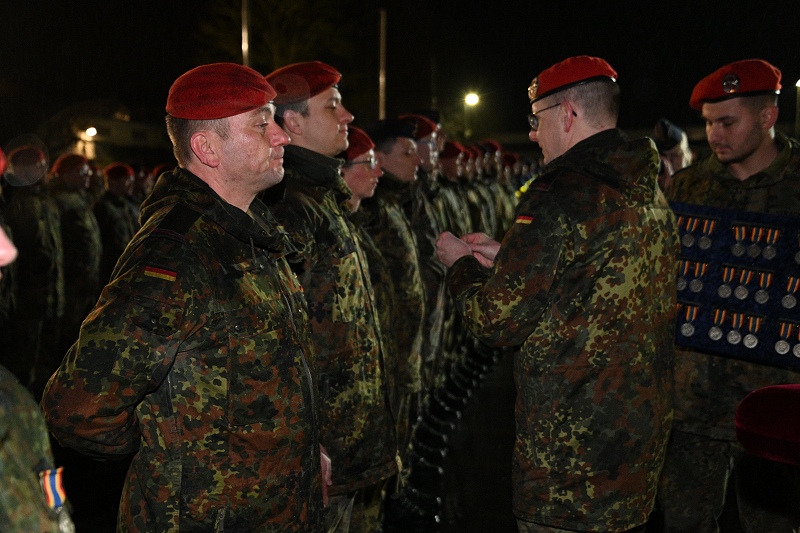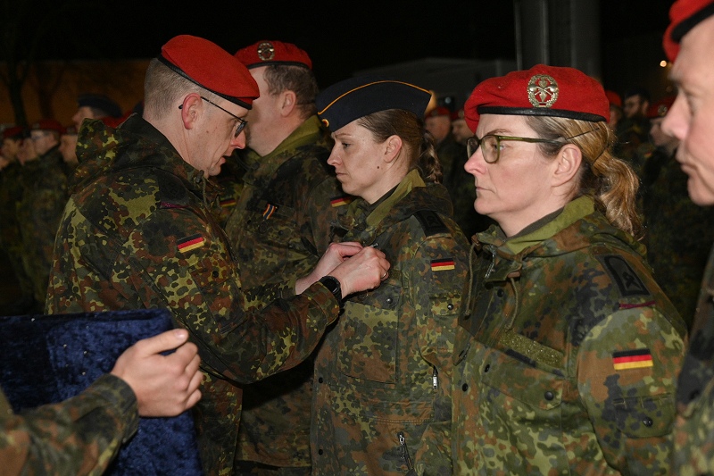 Kreis Höxter (TKu). Einsatzmedaille feierlich verliehen: Am Mittwochabend wurden 115 Soldatinnen und Soldaten des ABC-Abwehrbataillons 7 sowie Einsatzkräfte des Technischen Hilfswerkes (THW) aus den Ortsverbänden Höxter und Warburg für ihren herausragenden Katastropheneinsatz im Ahrtal und anderen von der Flut betroffenen Regionen in Höxter geehrt. Die Einsatzmedaille Fluthilfe 2021 wurde in einem feierlichen Appell in der General-Weber-Kaserne in Höxter verliehen. Symbolisch ungewollt regnete es dabei wie Bindfäden vom Himmel. Die gemeinsame Auszeichnung betone die enge Zusammenarbeit der Bundeswehr mit den "Blaulichtorganisationen", wie es Oberstleutnant Michael Gorzolka, Kommandeur des ABC-Abwehrbataillons 7, in seiner Ansprache betonte. Der Einsatz, der mittlerweile mehr als zwei Jahre zurückliegt, habe die Bundeswehr und die Blaulichtorganisationen enger zusammenschweißen lassen. Gorzolka erinnerte an die verheerenden Bilder der Flut und hob die bedeutende Rolle seines Bataillons hervor. Sie versorgten die Menschen mit aufbereitetem Trinkwasser, verhinderten Seuchenausbrüche, reparierten Technik und waren überall im Einsatzgebiet als helfende Hände präsent. Gorzolka beschrieb die Zerstörung im Katastrophengebiet als vergleichbar mit einigen Regionen in Afghanistan.