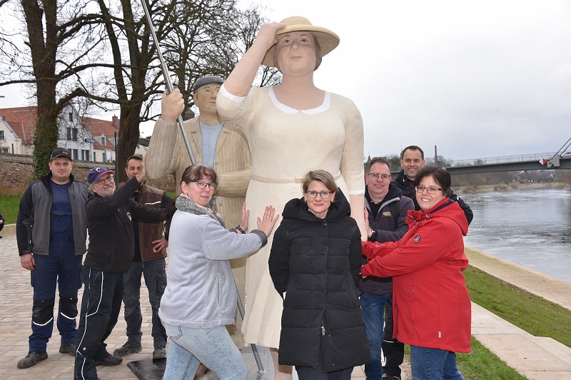 Höxter (TKu). Sie mit Sonnenhut und er mit Sonnenschirm. So stehen sie die nächsten Monate bis zum Herbst an der Weserpromenade in Höxter. Diese und 48 weitere Skulpturen haben Einzug in die Weserstadt zu halten, um Höxter ab sofort zu bereichern: die Alltagsmenschen! Am Dienstag wurden die 50 Beton-Skulpturen geliefert und in der Innenstadt von Höxter und an der Weser mit viel „Manpower“ aufgestellt. Bereits während der Aufbauphase an der Weserpromenade bewegten sich die Menschen nicht nur einfach daran vorbei, sondern sie blieben stehen, machten Fotos und fassten sie auch gelegentlich einmal an.