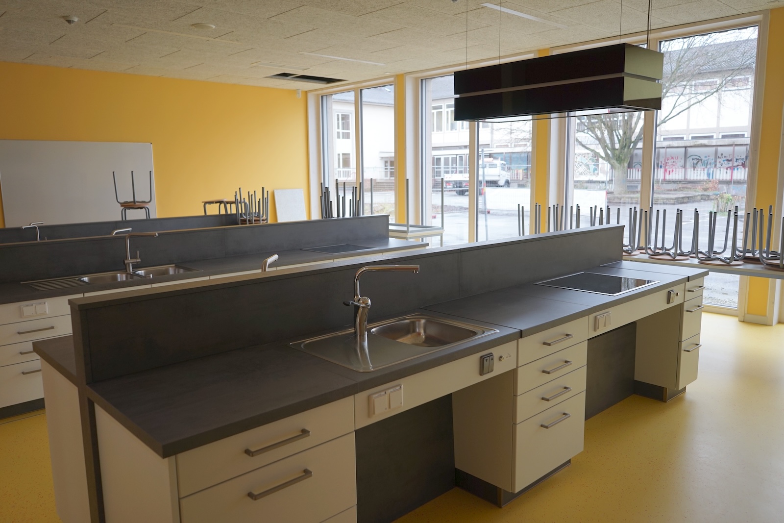 Die Schulgemeinschaft nutzte direkt die große Treppe in der Eingangshalle des Neubaus für eine gemeinsame Eröffnungsfeier. Es wurde gesungen, getanzt und die Schulleiterin Katrin Heine ließ die Geschichte des Neubaus noch einmal Revue passieren. „Am 12. Oktober 2021 legten wir im strömenden Regen den Grundstein für die neue Schule“, berichtet Heine und ergänzt: „Und bisher hat die Schule circa 26 Millionen Euro gekostet.“ Damit hatten die Kinder nicht gerechnet – sie reagierten mit Ausrufen wie „boar!“ und „oha!“. Doch die hellen Klassenräume, zahlreichen Fachräume und die strahlenden Gesichter der Kinder zeigen – diese Investition hat sich absolut gelohnt. Blickt man nun aus den neuen, modernen Räumlichkeiten auf das alte Schulgebäude, kann man gar nicht so richtig glauben, dass dort bis vor den Ferien noch der Unterricht stattgefunden hat.