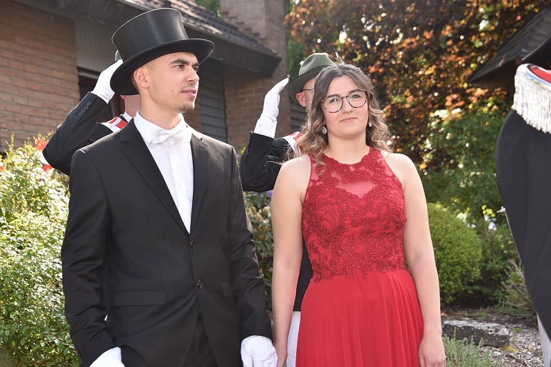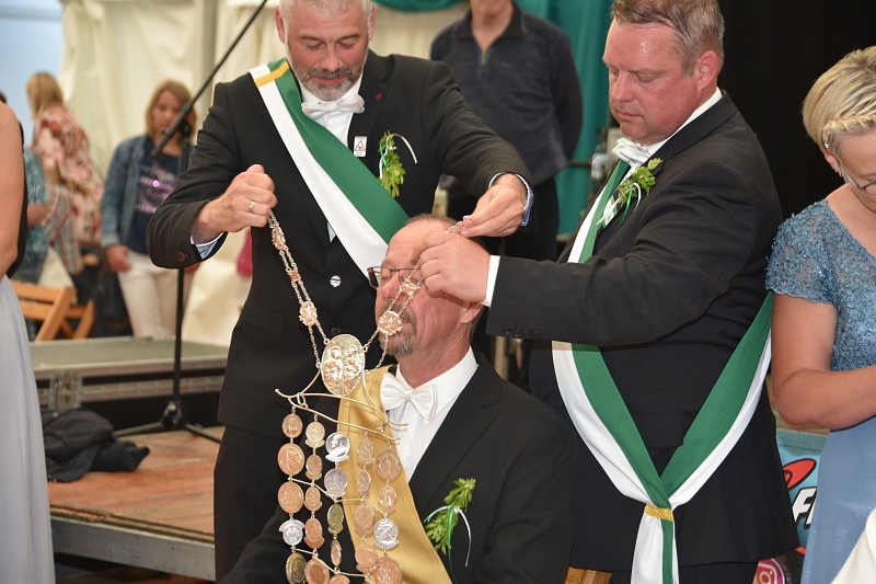 Unter großem Beifall marschierten am Abend die alten und neuen Majestäten in das Festzelt ein, begleitet von den eindrucksvollen Klängen des Spielmanns- und Fanfarenzuges Fürstenau. Mit einer etwa einstündigen Verspätung begann dort die feierliche Königsproklamation. Neben der Ehrung der neuen Könige wurden auch die alten Königspaare Sebastian und Silvia Balke sowie Niklas Stadermann und Mara Potthast würdig verabschiedet. Lothar Stadermann, der Vorsitzende der Schützengilde, verkündete die neuen Hofstaat-Mitglieder, die für eine Ortschaft dieser Größe bemerkenswert zahlreich sind.