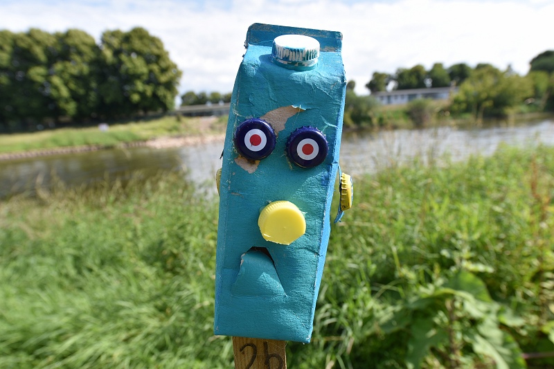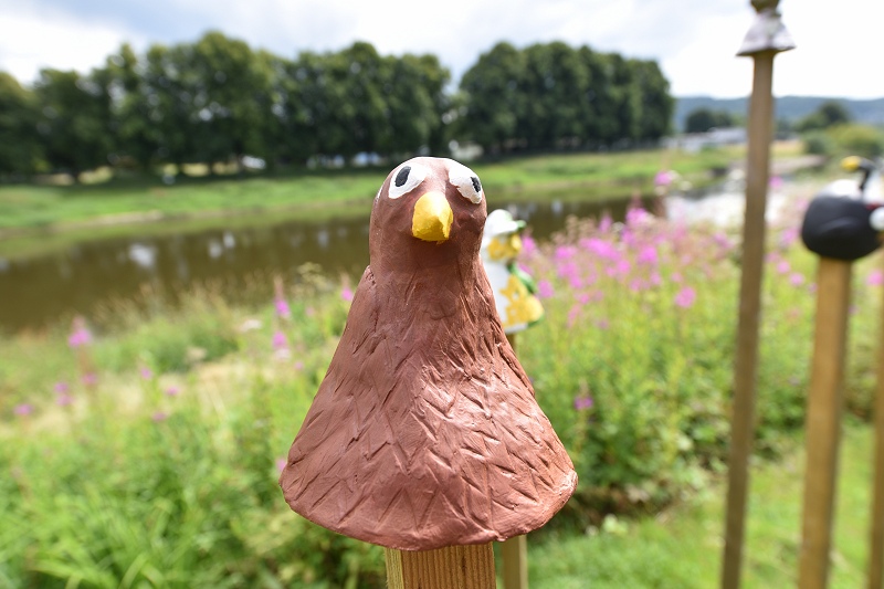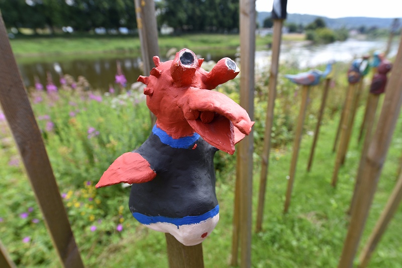Durch „Upcycling“ wurden hunderte dieser individuellen Kunstwerke erschaffen: Leere Konservendosen und Milchpackungen, CDs und Kronkorken wurden zu Vögeln umgestaltet. Marmeladengläser beherbergen ein Nest mit Vögelchen und Ei. Auch getöpferte Vögel hocken auf den Holzstangen, die zu Hunderten am Ufer aufgereiht stehen. Sämtliche Kunstwerke wurden mit wetterfester Farbe bemalt. „Es ist eine große Wertschätzung für die Kinder, dass ihre Kunstwerke im öffentlichen Raum an der tollen Weserpromenade ausgestellt sind“, meint Heike Edeler, Leiterin des König-Wilhelm-Gymnasiums. 140 ihrer Schülerinnen und Schüler schufen zum Beispiel Vögel aus Plastikflaschen mit Stoffflügeln, aber auch viele ausgesägte aus Holz. Eisvögel, Pinguine, Hühner, Raubvögel oder auch Störche sind an der mehr als 150 Meter langen „Vogelmeile“ ausgestellt. Der Weg an der Weserpromenade ist nicht eintönig und wir von Höxter-News.de möchten Euch diese Kunstwerke einmal näher vorstellen, mit Hilfe unserer Bildergalerie – aber seht selbst!
