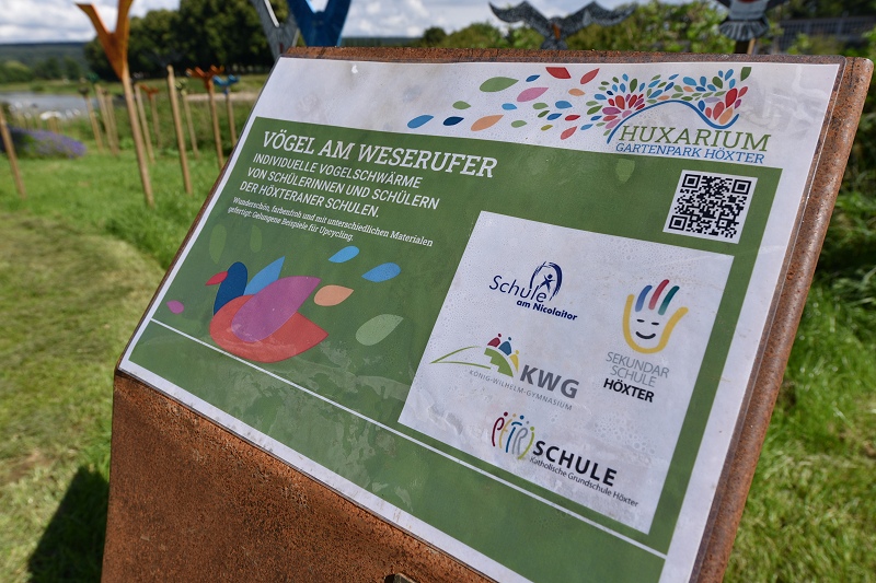 Höxter (TKu). Kleine Menschen – große Künstler: Dieser kunterbunte Vogelschwarm an der Weserpromenade im Huxarium Gartenpark Höxter geht an niemandem an der Route der Weserpromenade zwischen Höxter und Corvey so einfach vorbei: Unter dem Thema „Vögel am Weserufer“ sind in diesem Frühjahr mehr als 600 Schülerinnen und Schüler zu kleinen Künstlerinnen und Künstler geworden (Höxter-News berichtete). Diese Kunstwerke haben Charakter und sie haben es verdient, einmal explizit in einer Bildergalerie veröffentlicht zu werden. Denn: Die Resonanz dazu ist groß und die upgecycelten Kunstwerke sind ein absoluter Hingucker! Jeder Vogel hat seinen eigenen Charakter. Wir von Höxter-News haben uns auf dieser Kunstmeile einmal umgesehen und nur einige der vielfotografierten Vögel-Kunstwerke als Bildergalerie veröffentlicht. Es bedarf keiner großen Kunstmeile einer großen Metropole, denn diese kleinen Kunstwerke ziehen die Menschen in ihren Bann – wie in einem großen Museum. Insgesamt 640 Schülerinnnen und Schüler der Sekundarschule, des König-Wilhelm-Gymnasiums und der beiden innerstädtischen Grundschulen haben sich an dieser Aktion des Huxarium Gartenparks beteiligt. Die meisten dieser Kunstwerke bestehen aus Müll.