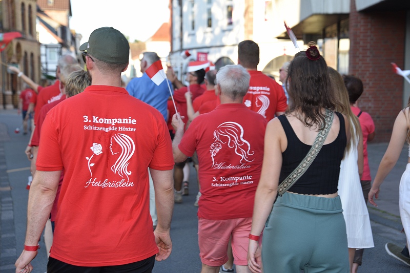 Höxter (TKu). So schön kann ein Schützenfest zu Ende gehen: Die dritte Kompanie der Schützengilde Höxter von 1595 e.V. ist mit Blasmusik und den Familienangehörigen von 0 bis 90 Jahren bei ihrer Schützenfest-Abschlussveranstaltung über alle Decks durchs Parkhaus in der Bachstraße marschiert. Und so färbte sich das Parkhaus durch die mehr als 100 Teilnehmenden in der Kompaniefarbe Rot. Bei diesem traditionellen Marsch erklang neben dem Weserlied auch immer wieder das Kompanielied „Oh Heideröslein“. Vorbei am Kompanielokal „Bürgerstuben“ wurden „Die Roten“, von „Den Gelben“ am Straßenrand begrüßt - der vierten Kompanie der Schützengilde. Der Umzug führte danach weiter durch die Innenstadt, wo Bürgermeister Daniel Hartmann überraschend dazu stieß. Er war gerade mit der internationalen Kommission „Entente Florale“ im Hotel Niedersachsen und hatte das Singen der dritten Kompanie gehört. Spontan überredete der Bürgermeister den Hauptmann Frank Lohmann und Spieß Thomas Spieker, die eigentliche Marschroute zu ändern und die vor dem Hotel Niedersachsen befindliche internationale Kommission mit dem „Heideröslein“ zu begeistern. Und die Jury war überrascht und begeistert, wie textsicher doch alle waren.