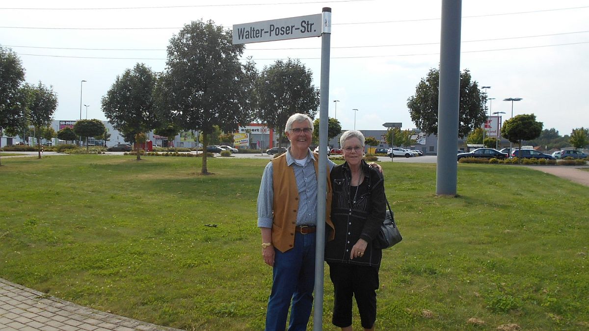 Daraufhin besichtigten sie das ehemalige Firmenareal, das heute als Poser-Gewerbepark bekannt ist und in dem sich unter anderem Möbel-Boss, Expert-Einbeck und Kaufland in der ehemaligen Tufting-Produktionshalle befinden. Mithilfe einer Luftaufnahme konnten die ursprünglichen Gebäude auf dem Gelände verortet werden. Die neue „Walter-Poser-Straße“ verbindet den Poser-Gewerbepark mit der Hannoverschen und Hullerser Landstraße. Auf einem nahegelegenen Stromverteilerkasten wurden Großfotos vom Firmengründer Walter Poser und der früheren Firmenansicht angebracht. Diese Idee, für die Dietmar Kolletzki Pate stand, wurde von Ralf und Ursula Kneflowski mit Dank und Anerkennung gewürdigt.