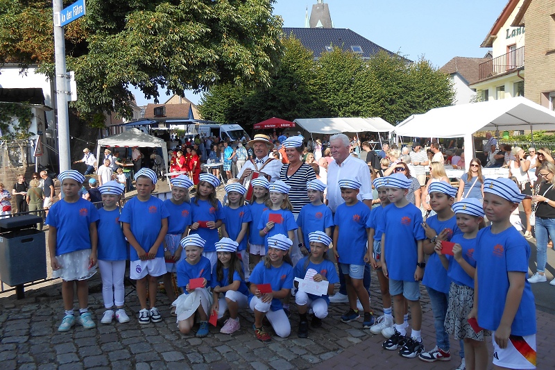 Ein besonderes Highlight des Hafenfestes war der Auftritt des Projektchors der Katholischen Grundschule Lüchtringen. 19 Schülerinnen und Schüler der Klassen 2 bis 4, unter der Leitung von Lehrerin Ute Lämmchen, führten das Seemannslied „My Bonnie is over the ocean“ auf. Begleitet von Peter Egelkraut an der Steyrischen Harmonika, gaben die Kinder, gekleidet in blauen Schul-T-Shirts und Matrosenmützen, ein stimmiges Bild ab. Der Chor erhielt tosenden Applaus und wurde mit einem kleinen Präsent des Vereins belohnt.