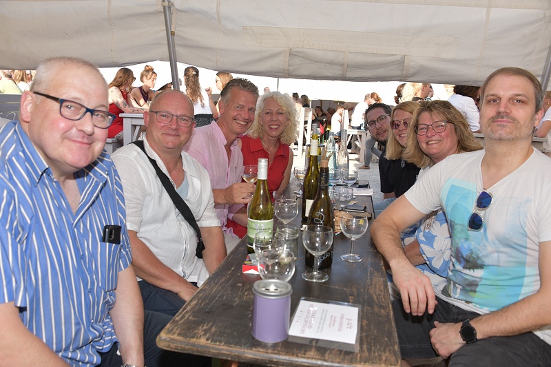 Höxter (TKu). Guter Wein, köstliches Essen, stimmungsvolle Musik und eine ideale Atmosphäre bei strahlendem Wetter: Das sechste Benefiz-Weinfest der Serviceclubs Ladies’ Circle 64 Höxter-Holzminden und Round Table 150 Höxter-Holzminden lockte am vergangenen Samstag über den gesamten Tag erneut geschätzte 600 Besucherinnen und Besucher in den Corveyer Domänenhof, darunter auch die Crew der Bürgerstuben in Höxter. „Heute haben wir frei und genießen den Nachmittag und Abend“, meinte Gabi Lallensack aus Höxter. Bereits vor 16 Uhr strömten die Gäste auf das Gelände vor dem Corveyer Weinhaus, um sich für den guten Zweck durch ein breites Angebot an Weinen zu probieren. „Bei traumhaftem Wetter und in malerischer Kulisse fand das 6. Weinfest bereits zum dritten Mal im Corveyer Domänenhof statt, mit Blick auf das imposante Westwerk von Corvey“, berichtet Tanja Baensch, Präsidentin des Ladies’ Circle 64 Höxter-Holzminden. Die Weinauswahl, eine vielfältige Mischung aus Weiß-, Rosé- und Rotweinen, wurde gemeinsam mit dem Corveyer Weinhaus zusammengestellt und fand großen Anklang bei den Besucherinnen und Besuchern. „Die Atmosphäre des Domänenhofs passt perfekt zum Weinfest“, erklärt Florian Hodes, Präsident des Round Table 150 und eine begeisterte Besucherin ergänzt wiederum: „… und das Weinfest passt perfekt zu Höxter.“ Neben den edlen Tropfen konnten sich die Gäste auch kulinarisch verwöhnen lassen. In diesem Jahr wurden Waffeln und Brezeln, gespendet von der Bäckerei Engel, angeboten. Zudem war der beliebte Foodtruck „3Stars“ mit seinem Angebot aus Burgern und Pommes vor Ort und sorgte für zusätzliche Gaumenfreuden.