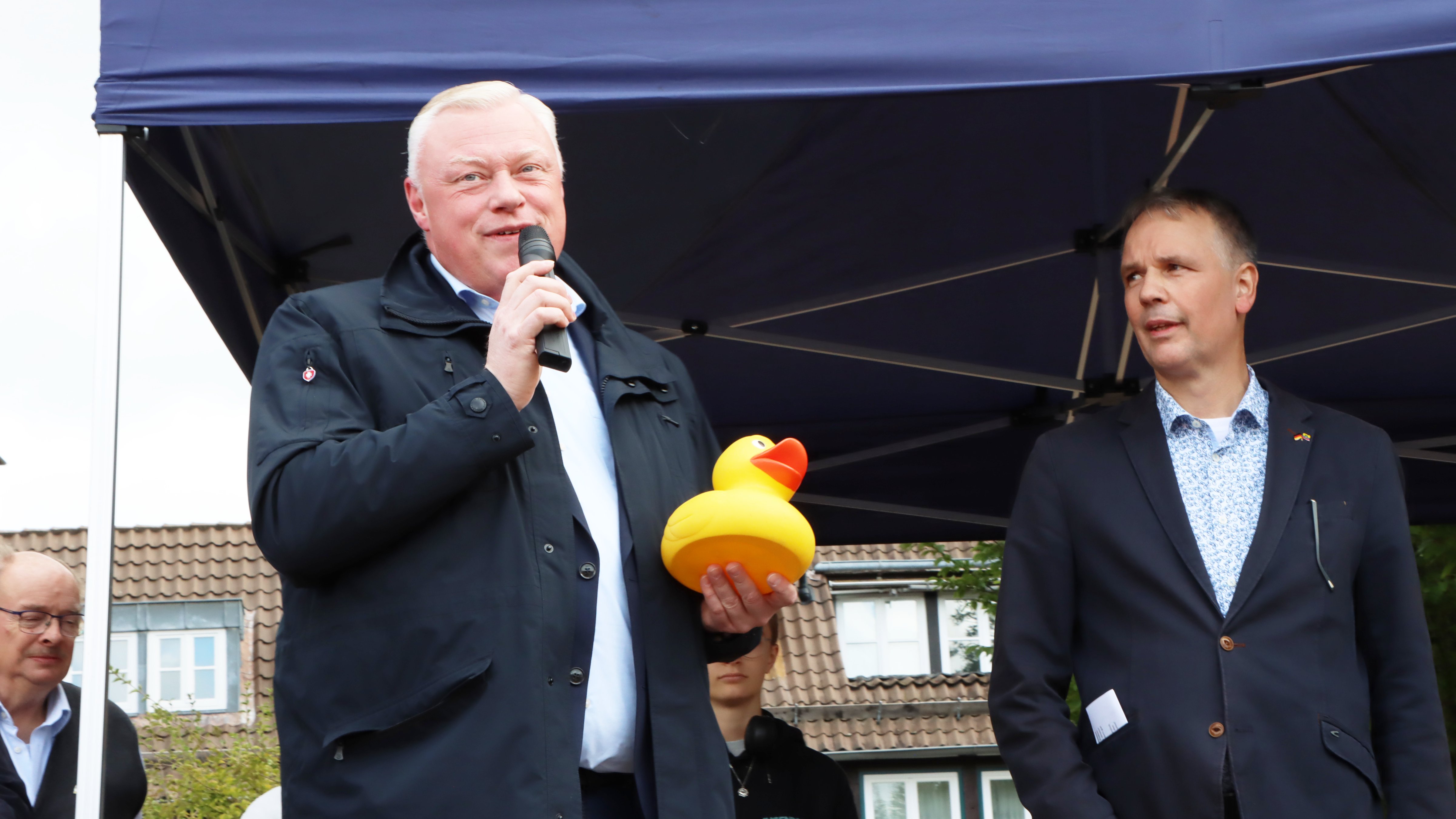 Auch Holzmindens Bürgermeister Christian Belke zeigte sich sichtlich erfreut über die rege Teilnahme des traditionellen Entenrennens. Der Schirmherr betonte, dass er besonders erfreut darüber sei, dass das Entenrennen in diesem Jahr wieder nach Holzminden zurückgekehrt sei. „Entenrennen is coming home“, betonte der Bürgermeister. Im vergangenen Jahr wurde das Entenrennen, anlässlich der Landesgartenschau, in Höxter ausgetragen. Auch Höxters Bürgermeister Daniel Hartmann war an diesem Tag zugegen und hob die gute Zusammenarbeit zwischen den beiden Städten Holzminden und Höxter hervor: „Es ist alles im Fluss“, freute er sich über die gute Kooperation.