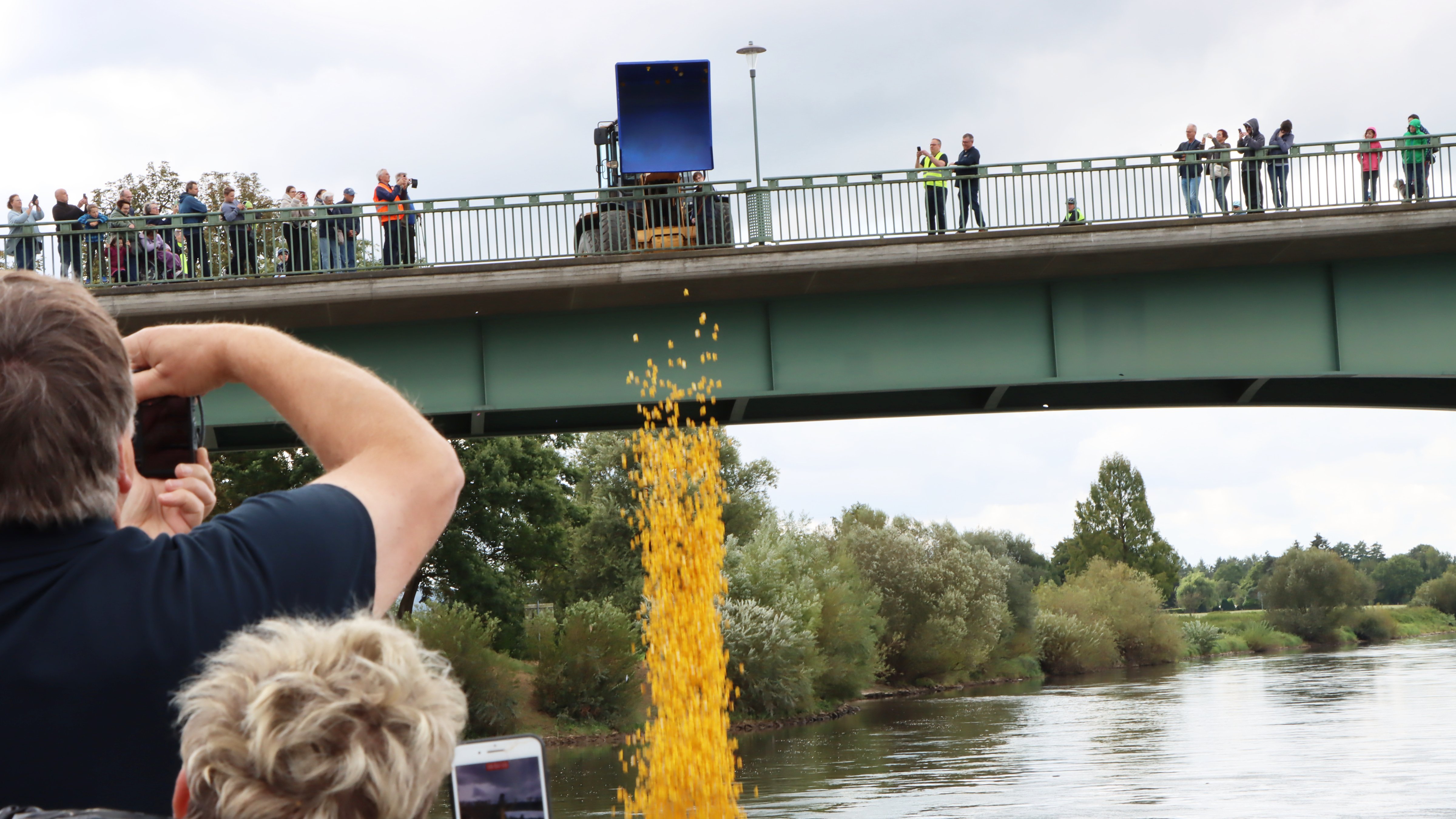 Kurz darauf startete das Entenrennen für die Kinder: 90 Jungen und Mädchen konnten am kostenfreien Entenrennen teilnehmen. Auf die ersten fünf Gewinner wartete ein Einkaufsgutschein des Werbekreis Holzminden. Aber auch die restlichen Jungen und Mädchen gingen nicht leer aus: „Jedes Kind, das teilgenommen hat, erhält von uns einen Sportbeutel mit Naschereien“, berichtete Flormann. Über den ersten Platz beim Kinderrennen freute sich die zehnjährige Luisa Stahlschmidt. Anschließend startete das Hauptrennen mit mehr als 5000 gelben Plastikentchen, welche in einem Container auf die Weserbrücke gefahren wurden und von dort aus Baden gingen: Am alten Speicher sammelten Mitglieder des THWs die Enten ein und fischten die ersten 22. Gewinner aus dem Wasser. Auf die Gewinner warteten tolle Preise: Der erste Preis war ein Reise-Gutschein im Wert von 1500 Euro. Auch der zweite Preis, ein Fahrrad-Gutschein im Wert von 1000 Euro, konnte sich sehen lassen. Der dritte Preis war ein Gutschein im Wert von 900 Euro eines großen Elektro-Händlers.