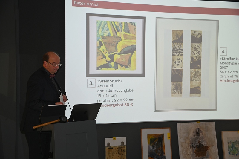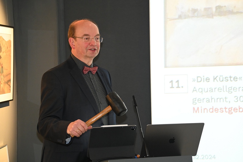 Höxter (TKu). „Bringen Sie Kunst in Ihr Leben“ lautete das Motto einer besonderen Benefizauktion, die am ersten Advent im Forum Anja Niedringhaus (FAN) Premiere feierte – Die vierte Auktion fand zum ersten Mal im Gebäude des FAN in der Westerbachstraße 33, dem sogenannten Tilly-Haus, statt. Rund 20 Kunstliebhaber und Bieter versammelten sich im FAN an der Westerbachstraße, um hochwertige Kunstwerke für den guten Zweck zu ersteigern. 84 Werke von über 40 Künstlerinnen und Künstlern standen zur Auktion, darunter Aquarelle, Ölgemälde, Radierungen, Holzschnitte, Kollagen und weitere Kunstgegenstände. Die Bandbreite beeindruckte: Alle Exponate waren von den Künstlern gespendet worden, um das FAN zu unterstützen, das die Erinnerung an die Pulitzer-Preisträgerin Anja Niedringhaus bewahrt. Mit Charme und Expertise führte der bekannte Chorleiter und Kulturmanager Hans Hermann Jansen durch die Versteigerung. Als Auktionator verstand er es, das Publikum mit humorvollen Kommentaren und geschicktem Einsatz seines Gummihammers zum Mitbieten zu animieren. „Es war eine großartige Gelegenheit, hochwertige Kunst zu erschwinglichen Preisen zu ersteigern“, erklärte Jansen, der auch Mitglied des FAN-Beirats ist.