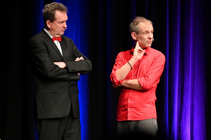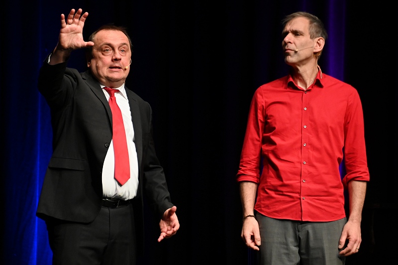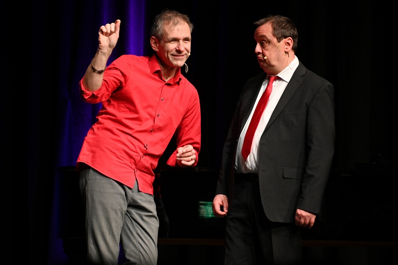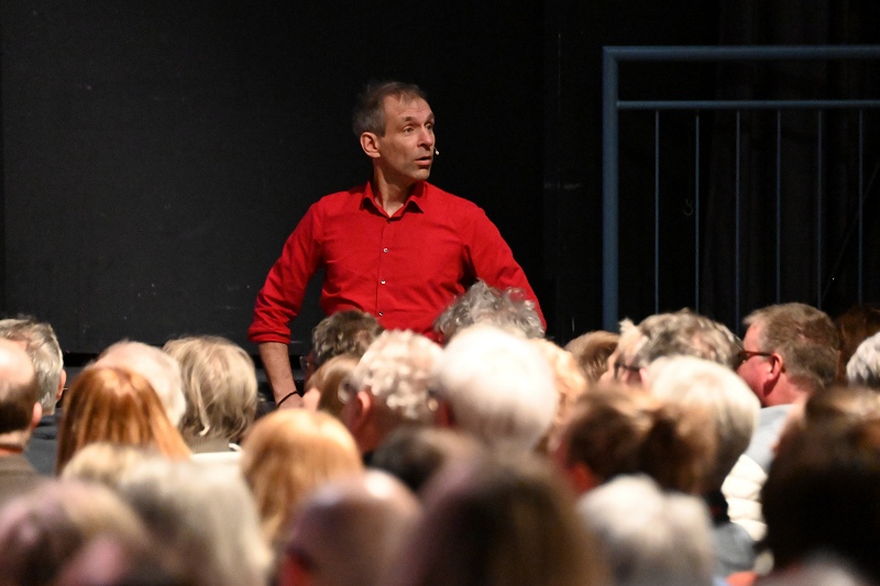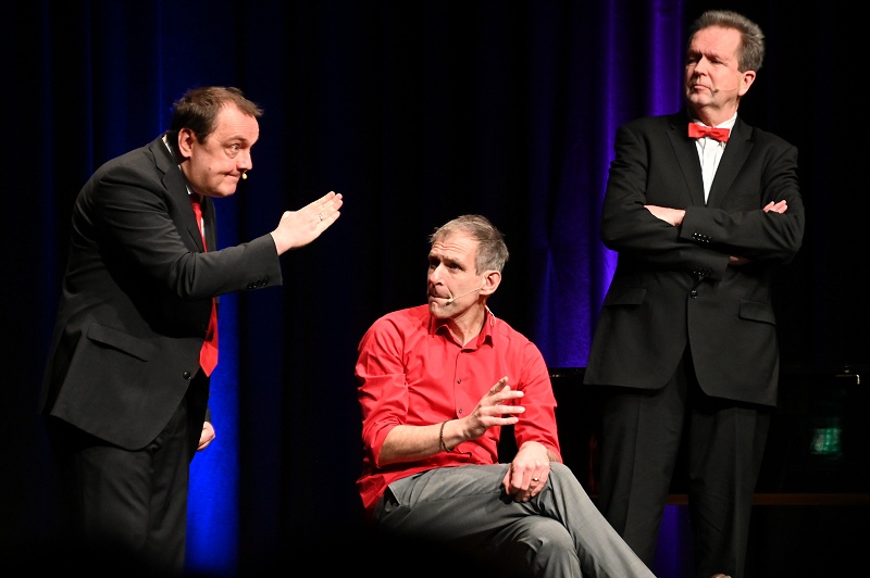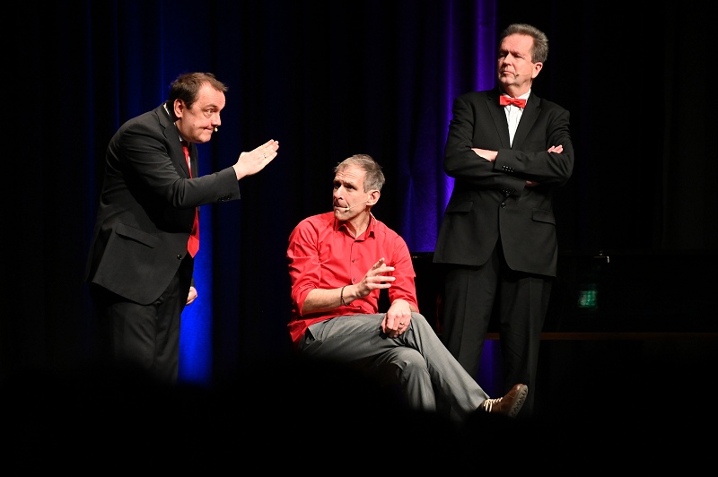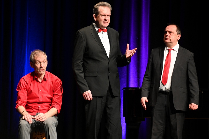 Die Evolution des Menschen malten sie ebenfalls in düsteren Farben: Vom „Homo Donaldo Trumpus“ über den „Homo Neandertalis“ bis zum „Homo Digitalensis“, dessen Körper bald keine Öffnungen mehr, sondern nur noch Schnittstellen besitze. „Ich zahle dann einfach mit Gesichtsscan“, meinte Harald Funke, woraufhin Philipzen ergänzte: „Ja, einfach den Kopf aufs Kassenband legen und Zack!, gescannt.“ Musikalisch brillierte das Trio mit Parodien auf Herbert Grönemeyer und Udo Lindenberg – ein Beweis ihres einzigartigen Talents, Politik, Gesellschaft und Musik humorvoll zu verbinden.
