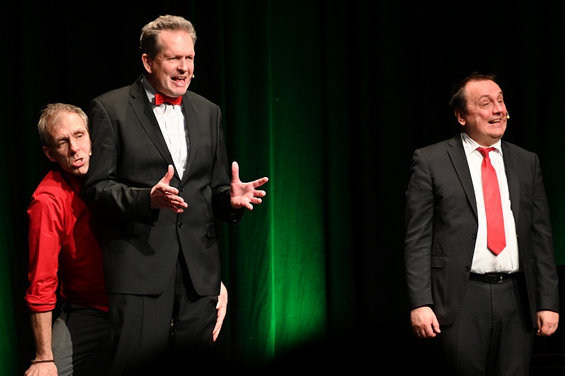Beverungen (TKu). „Time to say goodbye“, hieß es am vergangenen Wochenende in Beverungen: Es gibt Abende, die bleiben im Gedächtnis – und dann gibt es solche, die Geschichte schreiben. Das Kabarett-Trio STORNO sorgte mit seiner „Schlussinventur“ in der Stadthalle Beverungen für Letzteres. Zwei ausverkaufte Vorstellungen, 2.000 begeisterte Zuschauerinnen und Zuschauer und dazu Standing Ovations: So verabschiedete sich das Westfälische Trio STORNO in Beverungen von der Bühne. Nach 20 Jahren, mehr als 2.000 Auftritten deutschlandweit und unzähligen Pointen geht eine große Ära zu Ende – natürlich nicht ohne einen scharfzüngigen Rückblick. Harald Funke, Thomas Philipzen und Jochen Rüther blickten in Beverungen mit ihrem typischen bissigen Humor auf aktuelle Themen und zwei Jahrzehnte Kabarettkarriere zurück. Von der katholischen Kirche über Elon Musk und dem „Gruselkürbis“ Donald Trump bis hin zur deutschen Bürokratie sowie dem Bildungs-, Gesundheits- und Pflegenotstand – niemand wurde verschont.