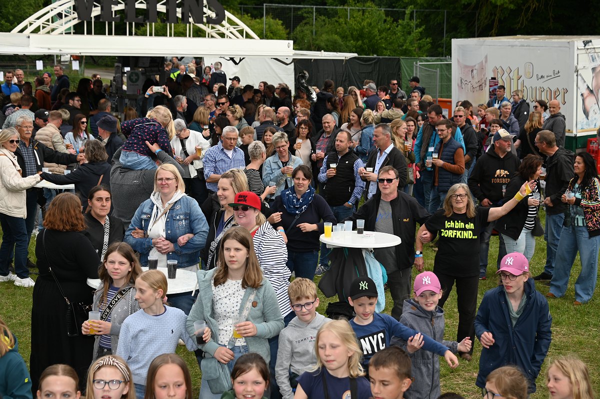 Trotz technischer Probleme zu Beginn sorgte DJ Toto für musikalische Einstimmung, bevor die Hauptakteure pünktlich um 16 Uhr die Bühne betraten. Mit ihrem Hit „Hurra, das ganze Dorf ist da!“ startete das Spektakel. Bier gab es für die fränkische Band auch auf der Bühne – allerdings, wie Tobias Thomann betonte, selbstverständlich alkoholfrei! Lautstark schmetterten sie ihre Lieder wie „Dorfkind“, „So singt das Dorf“ oder auch „Vogelbeerbaum“ heraus und verwandelten das beschauliche Weserdorf in eine brodelnde Feiermeile.