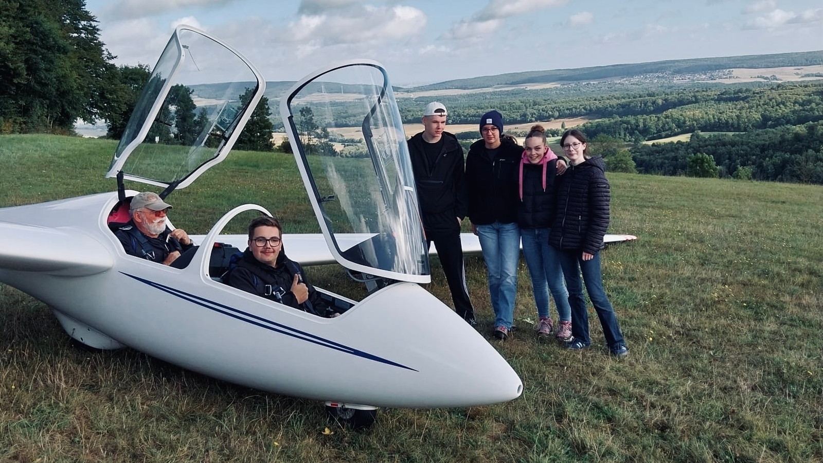 Kaum in der Luft wurden die Jugendlichen von dem unbeschreiblichen Gefühl des Fliegens überwältigt, und dank des Hangaufwinds konnten alle Schülerinnen und Schüler mehr als zehn Minuten in der Luft bleiben und auch selbst einmal das Flugzeug steuern. Der Blick über die frühherbstlichen Wälder und die Heimatorte der Jugendlichen war atemberaubend, und gerne wären sie noch länger oben geblieben. Doch dann stand der letzte Adrenalinkick an: die Landung. Aufgrund der Luftwirbel hinter den Bäumen musste der Fluglehrer, der die Jugendlichen begleitete, in einer dynamischen Wende mit viel Fahrt auf die Landebahn zusteuern. Erst kurz vor dem Boden wurde der Flieger abgefangen, butterweich auf der Wiese aufgesetzt und rollte dann etwas holprig zurück zum Startpunkt.