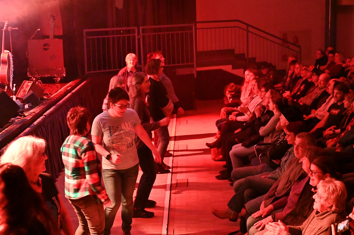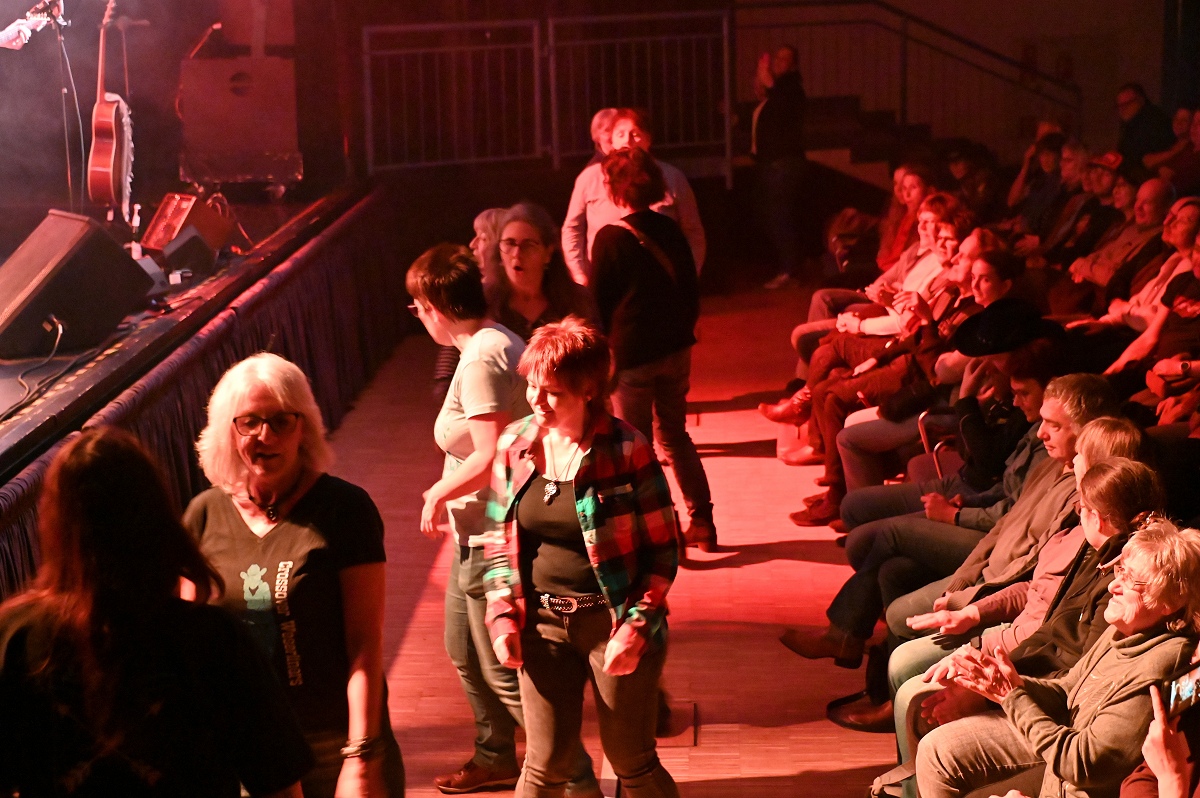Die Linedancer erwiesen sich als wahrer Stimmungsmotor in der Halle. Unter ihnen war auch die Höxteranerin Tamara Weber, Mitglied der Line-Dance-Gruppe „Crossover Weserliners“ des MTV Holzminden e.V. Sie ließ sich von der Musik mitreißen und tanzte am Rand der Bühne eine spontane Choreografie zu den bekannten Songs. Aktuell tanzen die „Crossover Weserliners“ in Holzminden regelmäßig mit etwa 10 bis 14 Personen. Der Name sei entstanden, weil die Gruppe ursprünglich in Höxter – in der ehemaligen Fahrschule Weber – begann und später „über die Weser wechselte“ zum MTV Holzminden, erklärte Weber. „An diesem Abend hätten wir zu allen Liedern tanzen können“, sagte sie. Der Bühnenrand wurde so kurzerhand zur zweiten Bühne, von der aus sich die Dynamik wie eine Welle durch die gesamte Stadthalle ausbreitete.