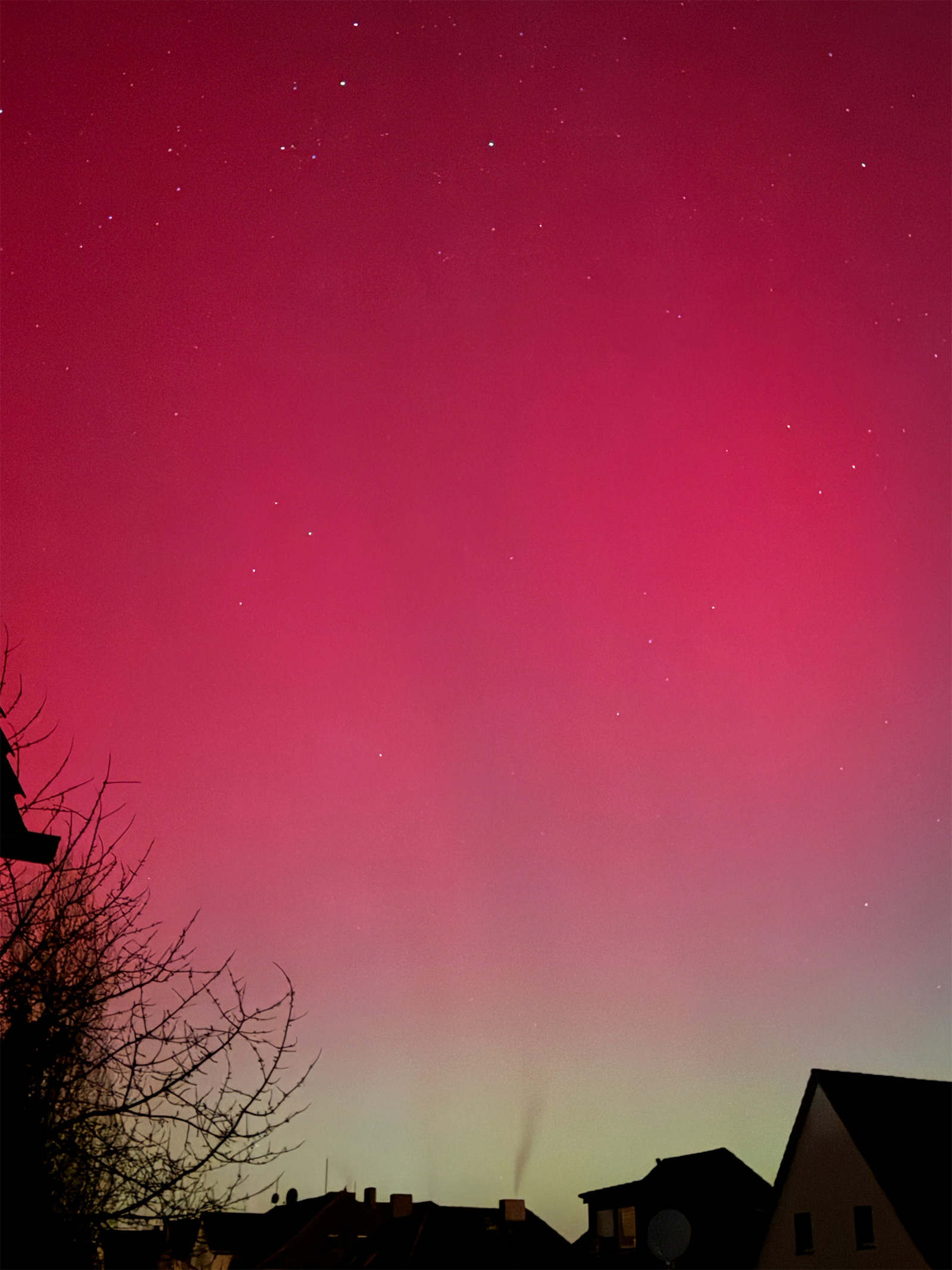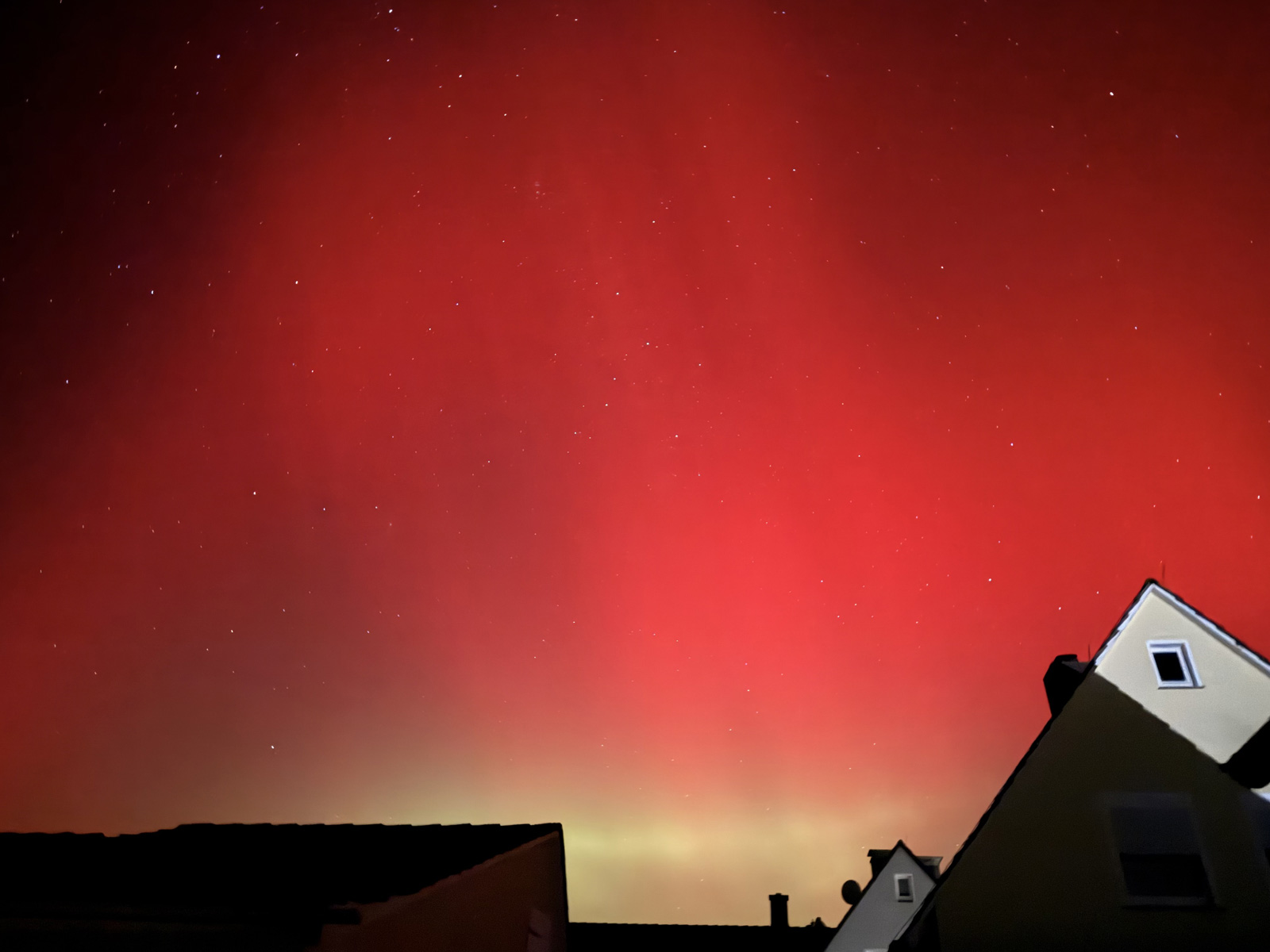 Normalerweise erscheinen Polarlichter in Mitteleuropa, wenn überhaupt, eher als blasses, weißliches Leuchten. Dass in dieser Nacht auch rötliche und grünliche Farbtöne deutlich erkennbar waren, gilt als klares Zeichen für eine besonders hohe Intensität. Sichtbare Farben mit bloßem Auge treten nur bei sehr starken geomagnetischen Ereignissen auf.