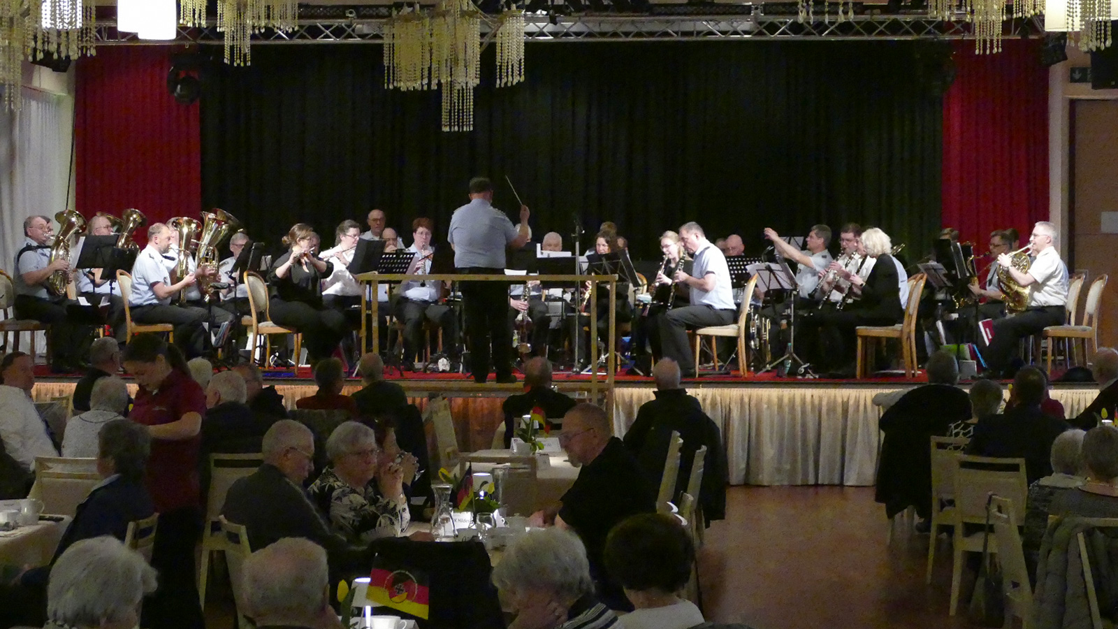 Im weiteren Programm boten die rund drei Dutzend Musikerinnen und Musiker den Gästen einen abwechslungsreichen Mix aus Märschen wie dem „Russian March“, „Nibelungen-Marsch“ oder „King Robert March“, aber auch Polkas wie „Im weißen Rössl“ oder „Von Freund zu Freund“. Ebenso waren Stücke aus „Phantom der Oper“ und „Beauty and the Beast“ Teil des rund dreistündigen Konzerts.