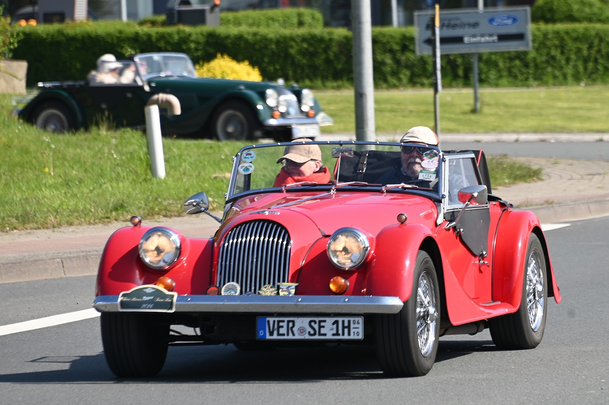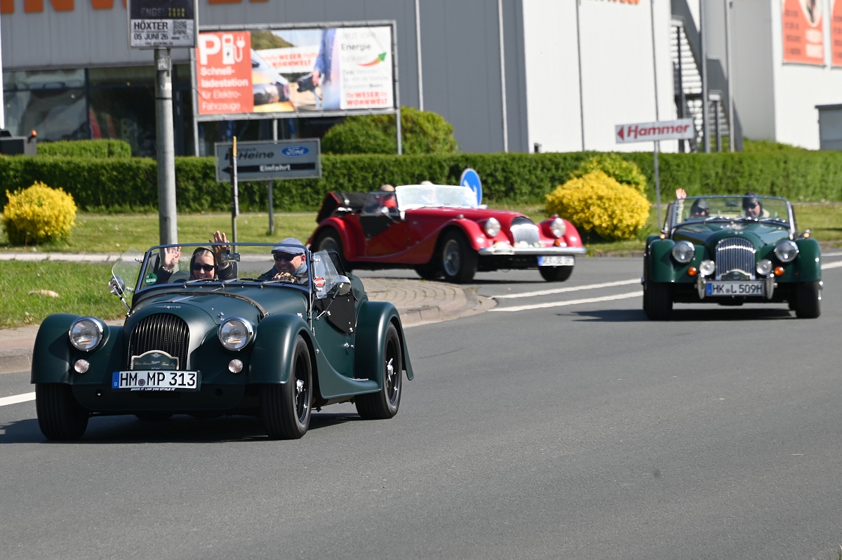 Höxter (TKu). Eine ungewöhnliche Fahrzeugkolonne hat sich am Samstagvormittag bei strahlendem Sonnenschein von Höxter aus durch das Weserbergland in Bewegung gesetzt: 14 handgefertigte Sportwagen der britischen Marke Morgan Motor Company starteten mit ihren Fahrerinnen und Fahrern aus verschiedenen Teilen Norddeutschlands vom Parkplatz eines Burger-Restaurants zur zweitägigen Tour durch die Region.