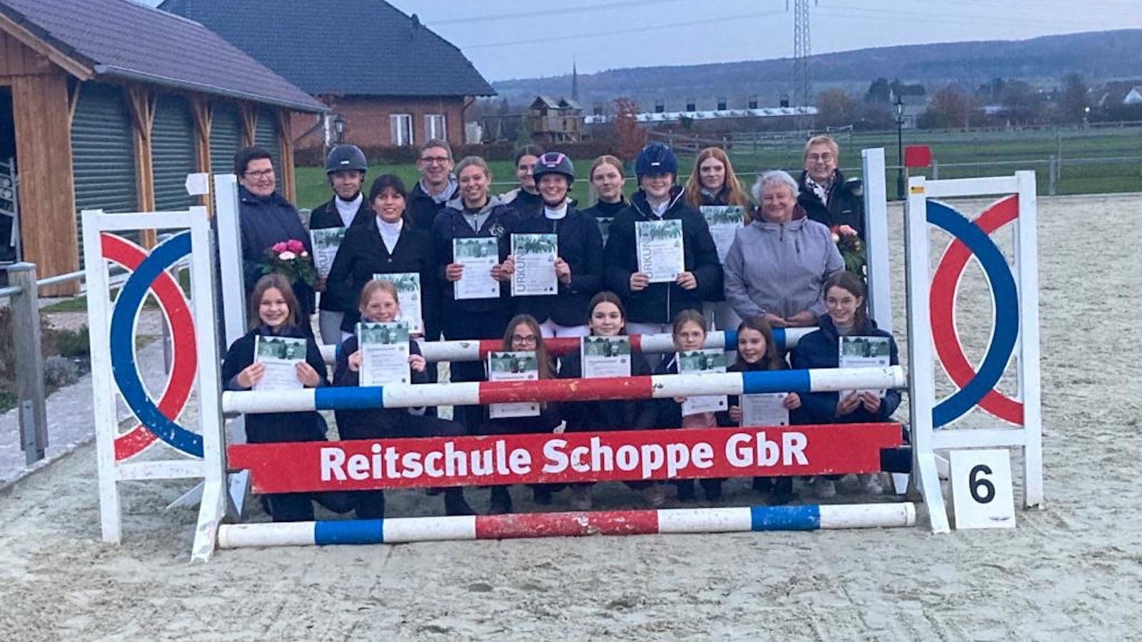 Bevern (red). Am Samstag, 26. November, führte der Reit- und Fahrverein Beveraner Land e.V. zum wiederholten Mal die Sonderprüfungen zum Abschluss eines Reitabzeichenlehrgangs durch. Bei schönem winterlichem Wetter fanden die Abschlussprüfungen auf der Reitanlage Schoppe in Bevern statt. Der Tag startete mit der Abnahmeprüfung des Basispasses Pferdekunde. Dabei standen 12, sehr aufgeregte junge Damen, den Richterinnen Rede und Antwort und wurden intensiv zu dem Umgang mit dem Pferd befragt.