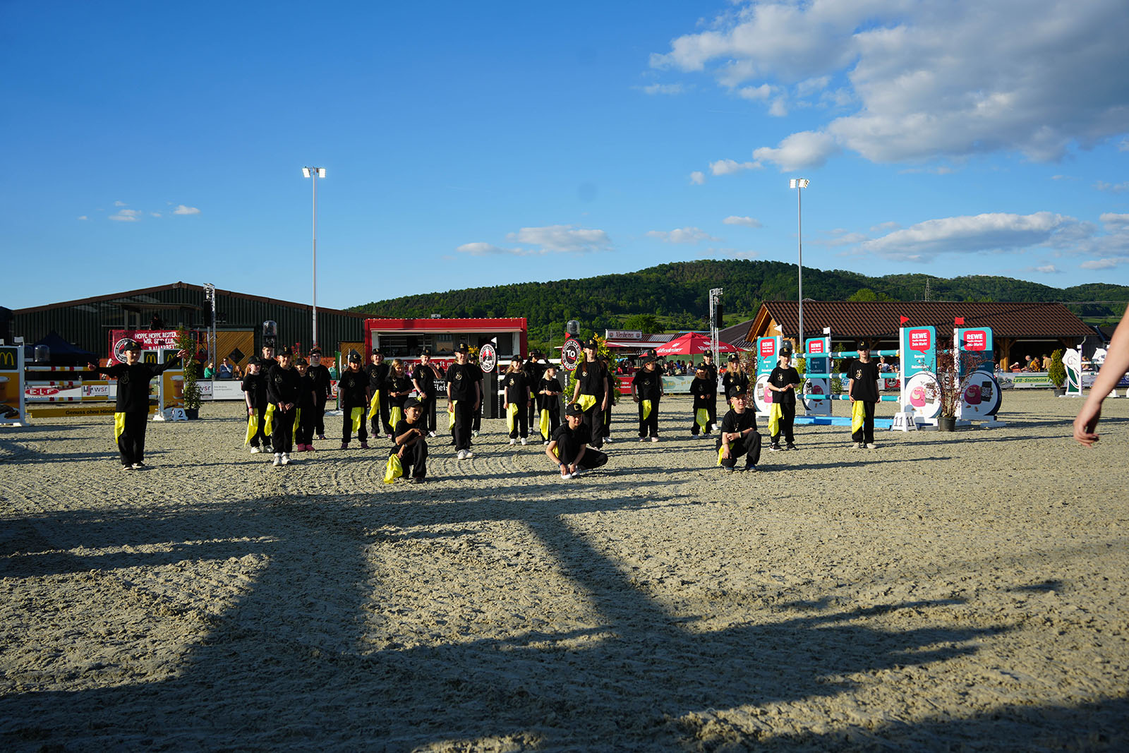 In der ersten Pause der Springprüfung zeigte die "Happy Dance Crew" aus Bevern, was sie draufhatte. In einer Choreografie von rund 30 Kindern präsentierten die jungen Talente mitsamt ihrer Tanzlehrerinnen eine beachtliche Hip-Hop-Performance. Gekleidet in Schwarz mit einem gelben Bandana, welcher in der Hose klemmte, fielen sie nicht nur auf – sie waren auch passend zum Lied "Black and Yellow" von "Whiz Khalifa" gekleidet, zu welchem sie ebenfalls performten.