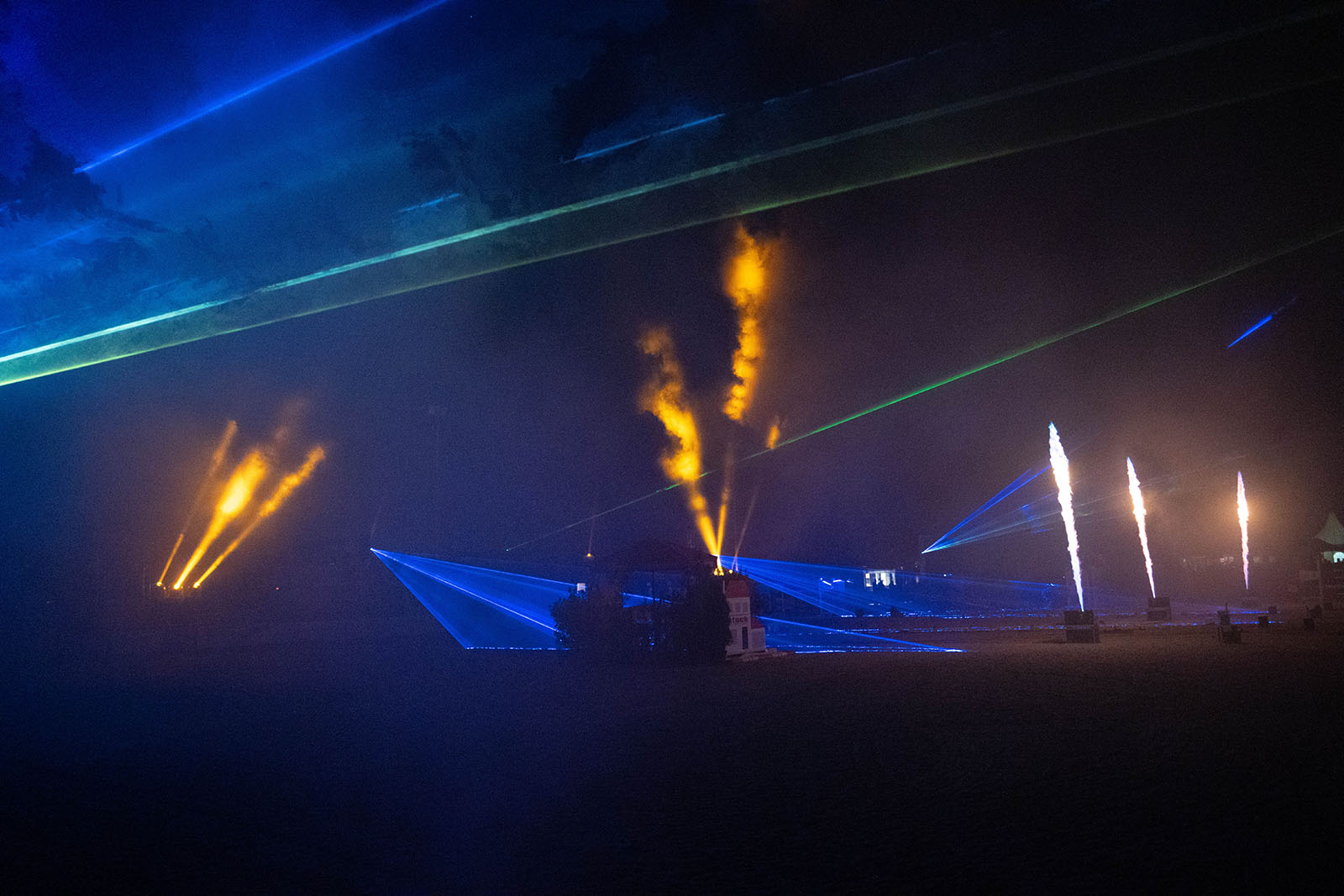 Nach dem Auftritt Tappes wurde es feurig heiß: Das Team von "Flamba" performte auf dem Reitturnier mit beeindruckenden Darbietungen. Es sprühten Funken, Fontänen aus Feuer erhellten den Platz, und die Wärme der Flammen erwärmte die abgekühlte Abendluft. Nach der Feuershow folgte eine beeindruckende Lasershow, die in Kombination mit epischer Musik ein unvergessliches Erlebnis bot.