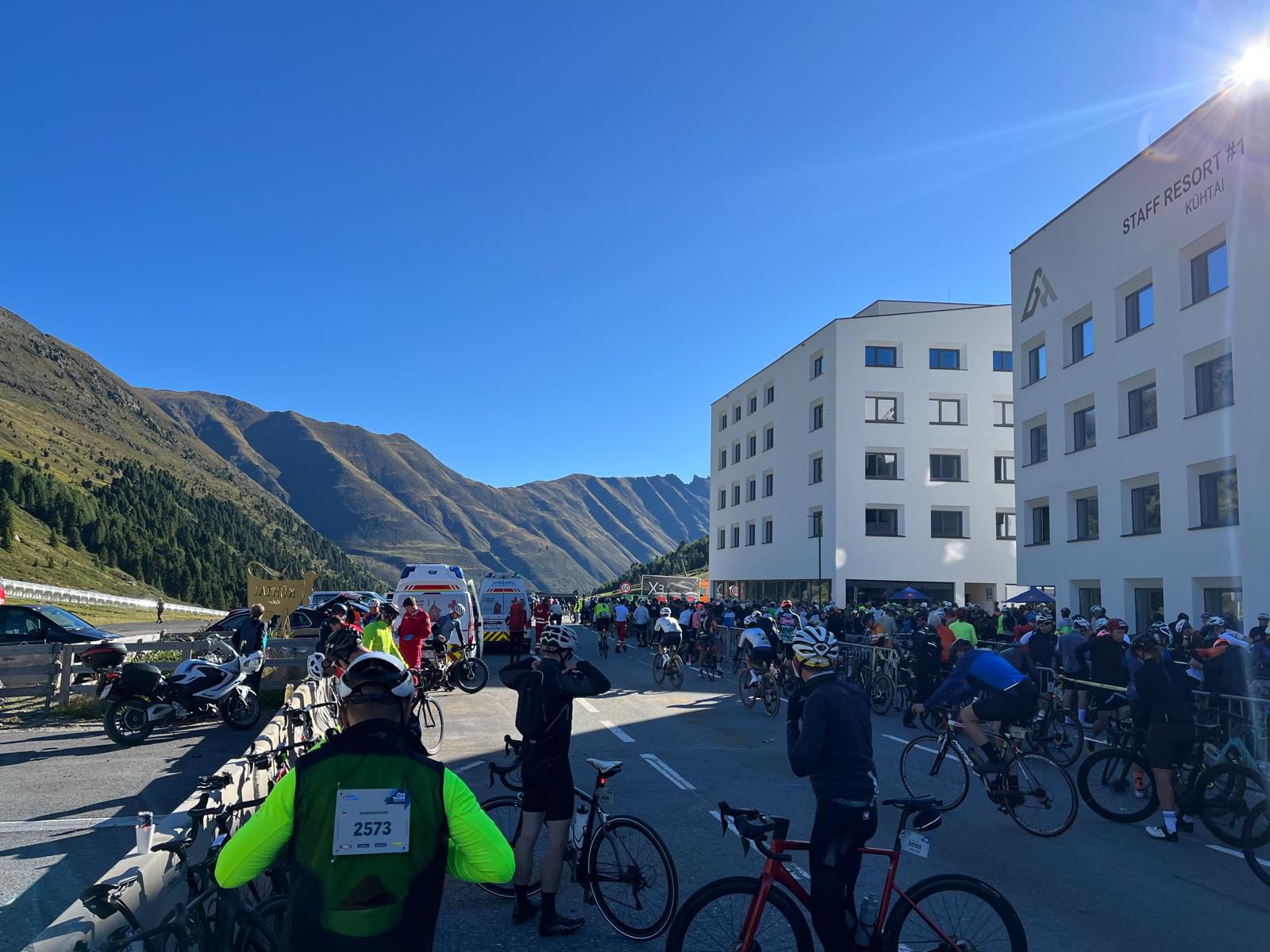 „Die Strecke ist besonders“, berichtete Oliver-Jens Schiller im Gespräch. „Teilweise sind die Pässe komplett abgesperrt – die Kulisse ist einfach unglaublich.“ Mit strahlendem Sonnenschein am Renntag und fünf perfekt organisierten Verpflegungsstationen fanden die Fahrer ideale Bedingungen vor. Das Ziel: Die 14-Stunden-Zeitbegrenzung einhalten – wer zu spät kommt, wird aus dem Rennen genommen und erhält kein Finisher-Trikot.