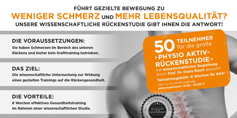 Rückenschmerz ist die Volkskrankheit Nummer Eins unter den Deutschen. Deshalb wird Prof. Dr. Klaus Baum die „Physio Aktiv Rückenstudie“ im Fitnesszentrum PuR Vital in Stadtoldendorf wissenschaftlich leiten. Mitmachen können alle, die Schmerzen im unteren Rücken haben und noch kein Krafttraining betrieben haben. Derzeit werden 50 Teilnehmer ab 18 Jahren gesucht, die vom 15. August bis 25. September zwei mal wöchentlich mitmachen wollen.