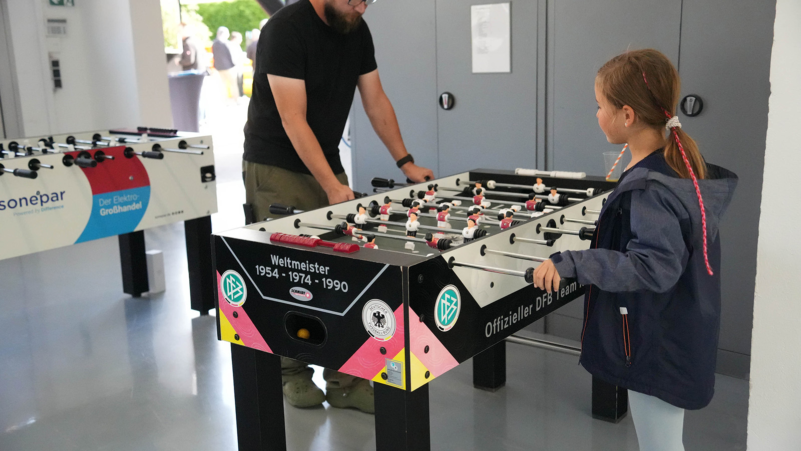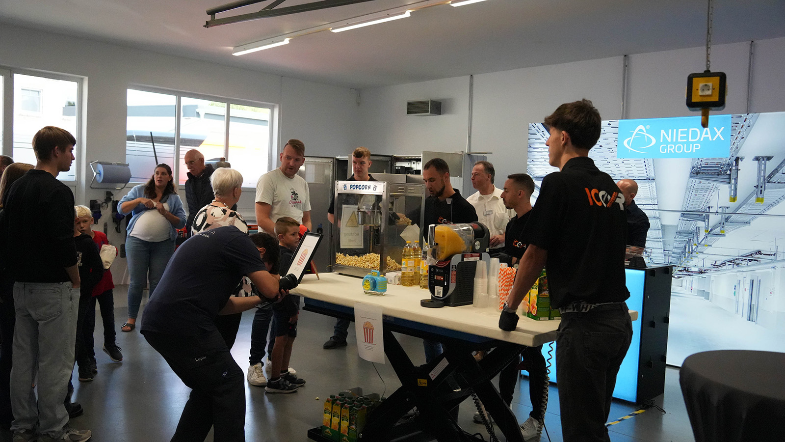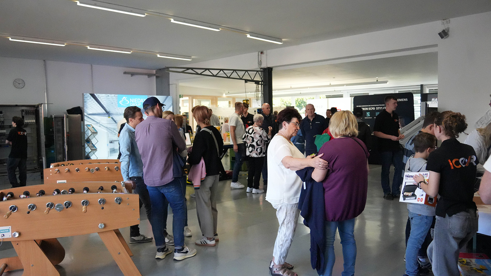 Die kleinen Gäste tobten sich währenddessen auf der Hüpfburg aus oder wagten ein paar Runden auf dem Rodeo, während die Eltern über das Fachliche ins Gespräch kamen. Auf einer kleinen Messeausstellung präsentierten Partnerunternehmen ihre Neuheiten: Werkzeuge von „HILTI“, der eindrucksvolle Produktsprinter von „BTI“ oder die Beratung von „sonepar“ zogen die Aufmerksamkeit der Besucher auf sich. In den Garagen des Unternehmens zeigten namhafte Marken wie „Siemens“, „Wago“, „Busch-Jaeger“, „Hensel“, „Niedax Group“, „Siteco“ und „Knx/Jung“ ihr Portfolio – begleitet von kleinen Extras wie Popcorn, Slushis oder Mitmachaktionen. Wer zwischendurch Lust auf Abwechslung hatte, konnte sich beim Tischkicker spannende Duelle liefern.