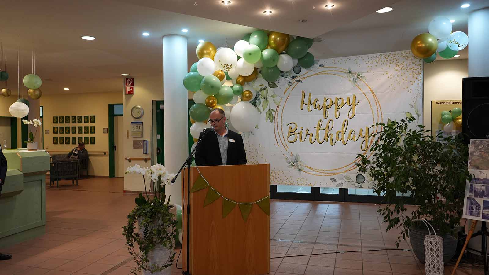 Im Rahmen einer kleinen Feier im Foyer der Seniorenresidenz begrüßte der Einrichtungsleiter die Gäste zunächst mit einem Rückblick: Die Seniorenresidenz eröffnete im September 1995. 36 Millionen D-Mark seien in 14 Monaten aufgewendet worden, um die moderne Residenz zu bauen, wobei Firmen aus der Region maßgeblich beteiligt gewesen seien. „Anfänglich gab es in der ‚Resi‘ noch selbstständige Physio- und Ergotherapeutinnen und -therapeuten“, erzählte der Einrichtungsleiter und führte weiter aus: „Legendär waren damals das Bewegungsbad und die Kneippanlage sowie die großzügige Ausstattung der Zimmer mit Terrasse und Balkon. Der Friseursalon, Räumlichkeiten für die Fußpflege und die Cafeteria wurden auch von den Bürgerinnen und Bürgern genutzt.“ Die „Resi“ habe sich so in Stadtoldendorf und in der Umgebung zu einer festen Größe etabliert.